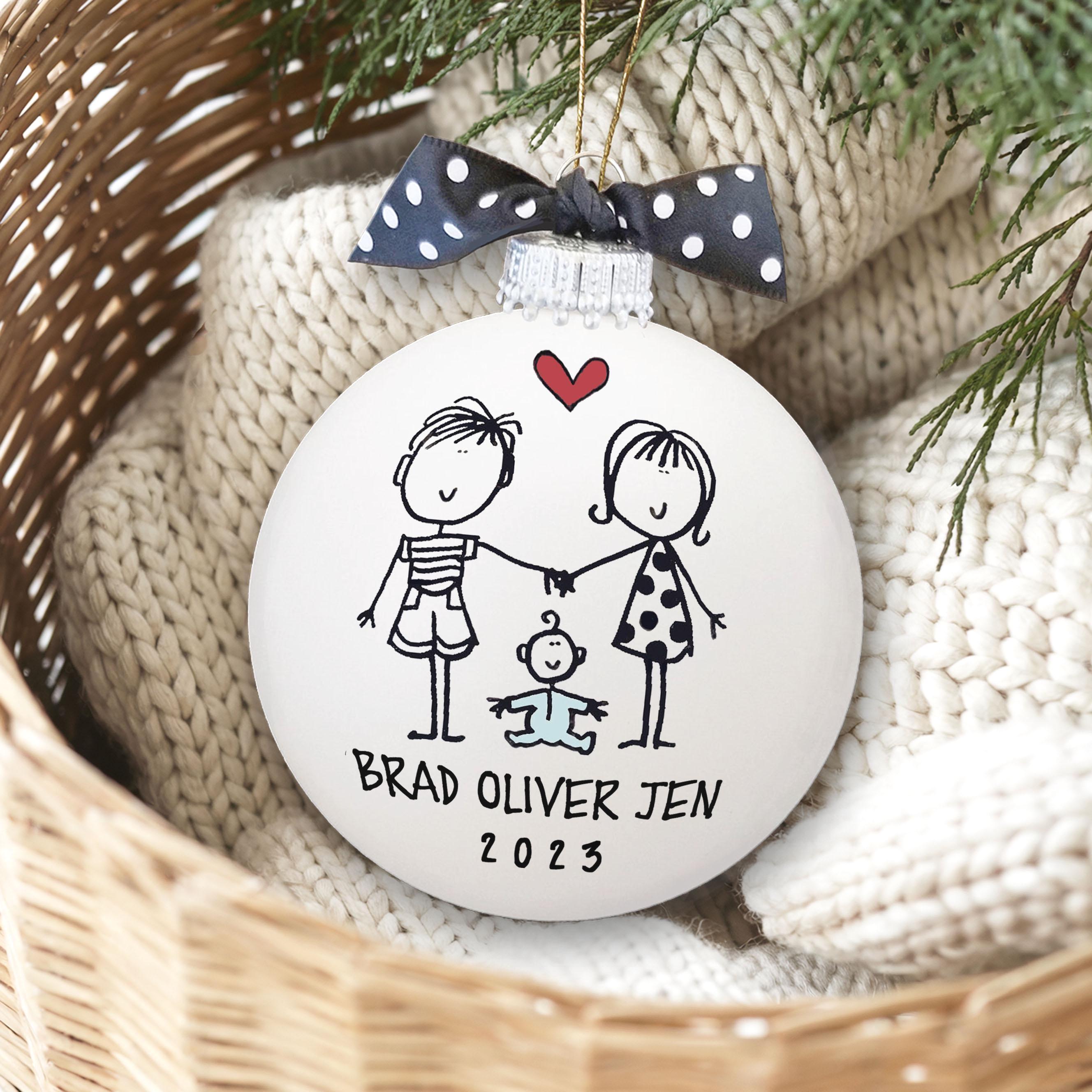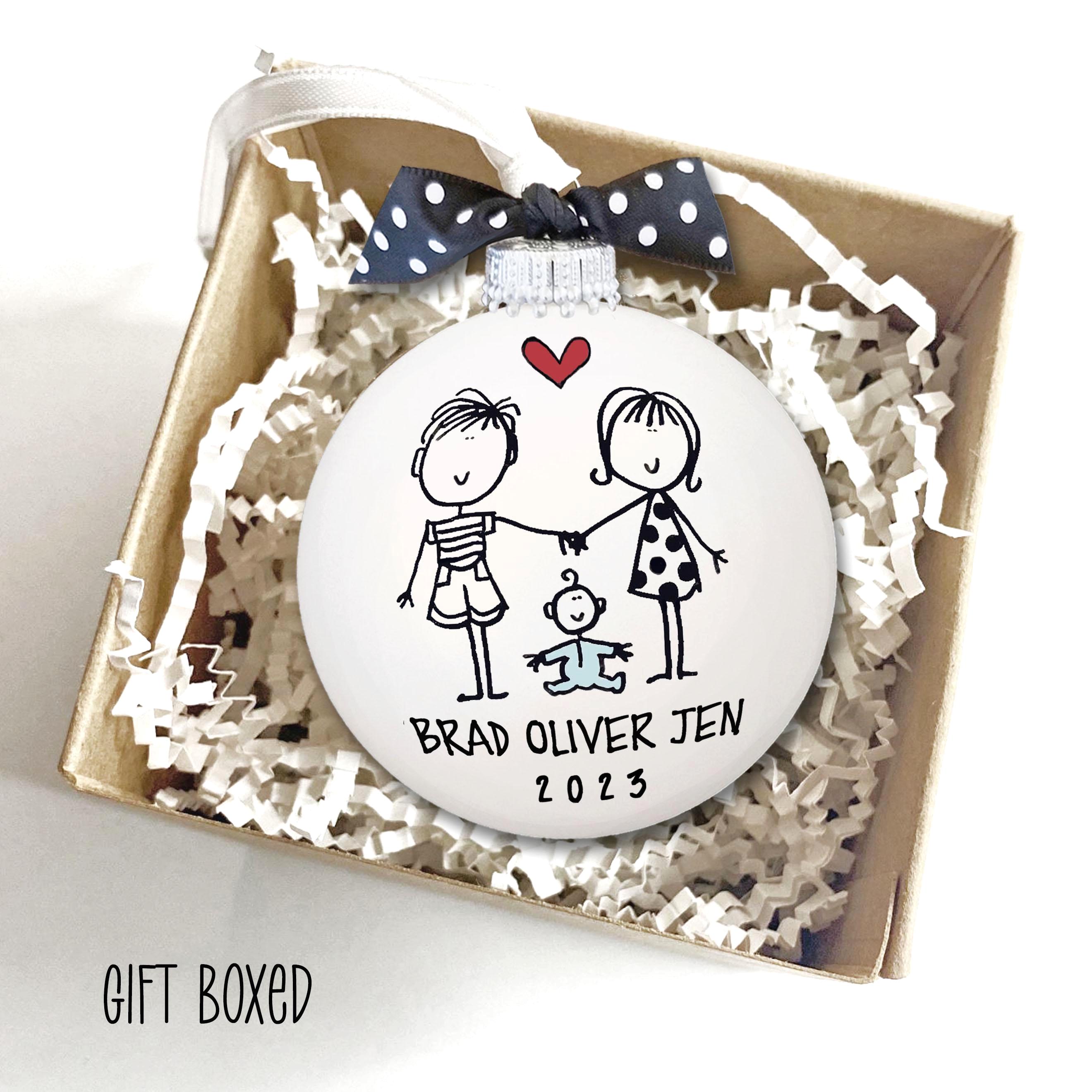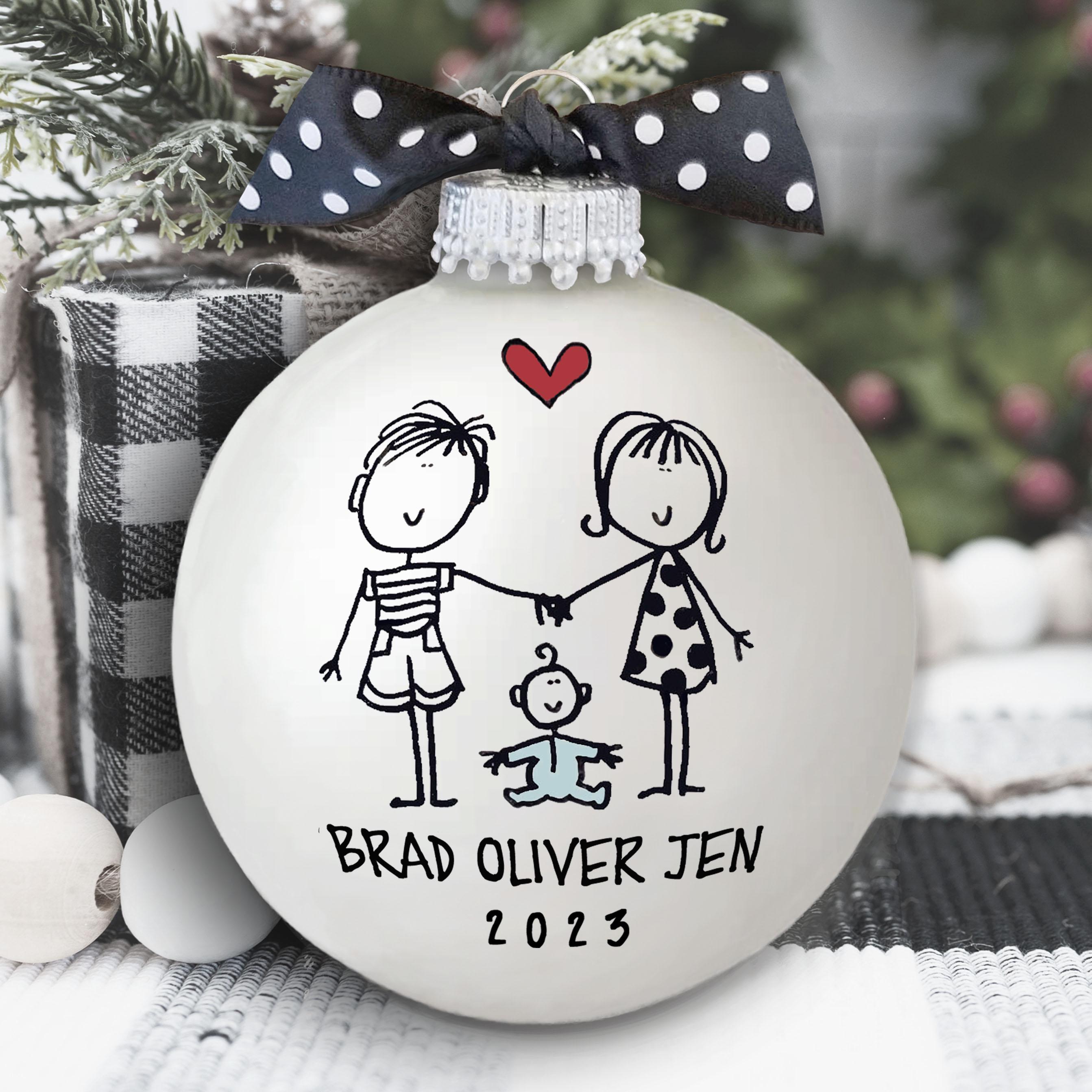 Looking for a unique personalized handmade gift to celebrate the family? These delightful personalized ornaments are the stand-out gift you're searching for! Individually hand-drawn and painted, each keepsake ornament is customized with names and date, and makes a delightfully unique and heart felt gift for those you love! This personal, thoughtful, one-of-a-kind gift perfectly celebrates the joy of the holiday season!