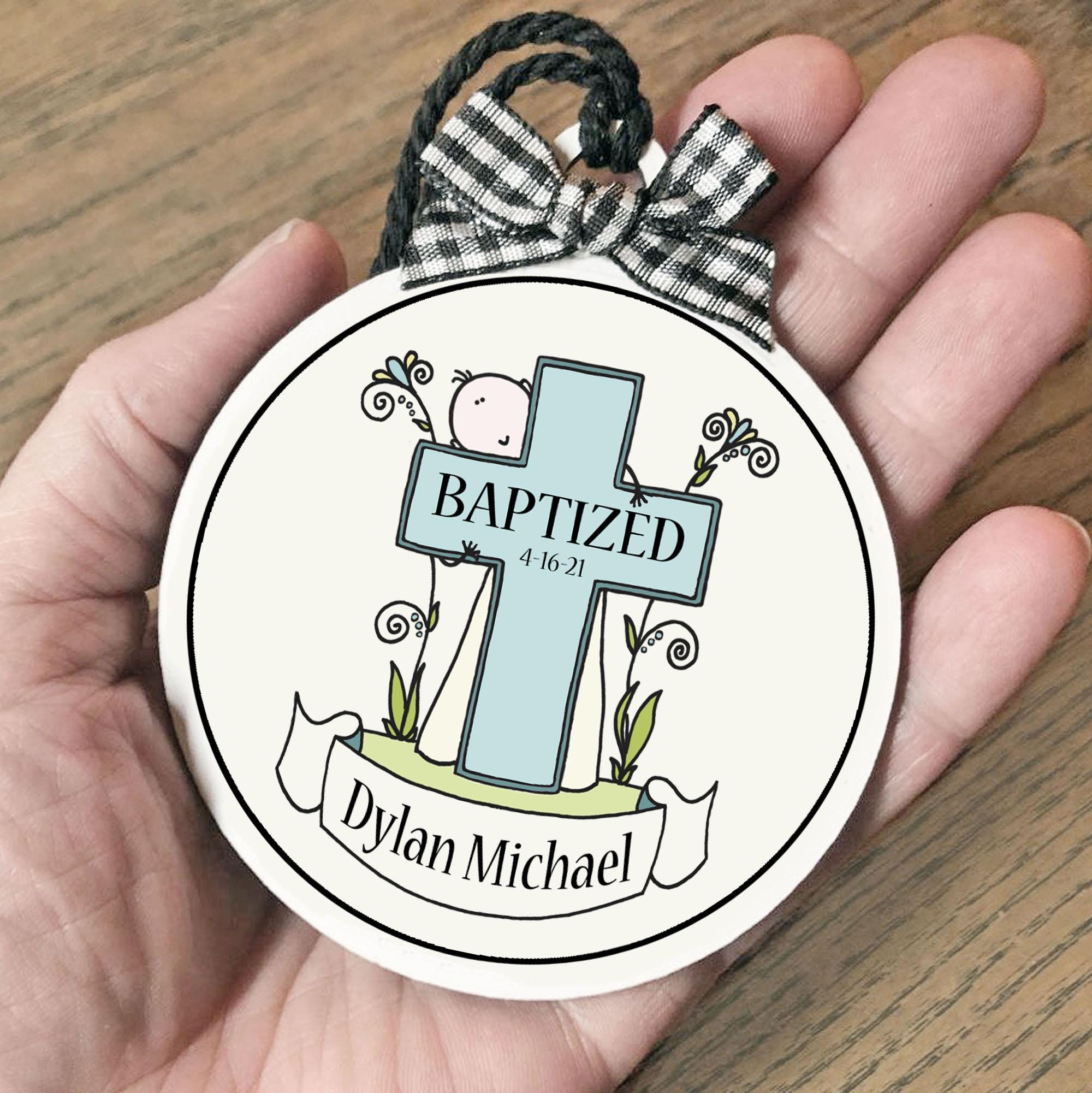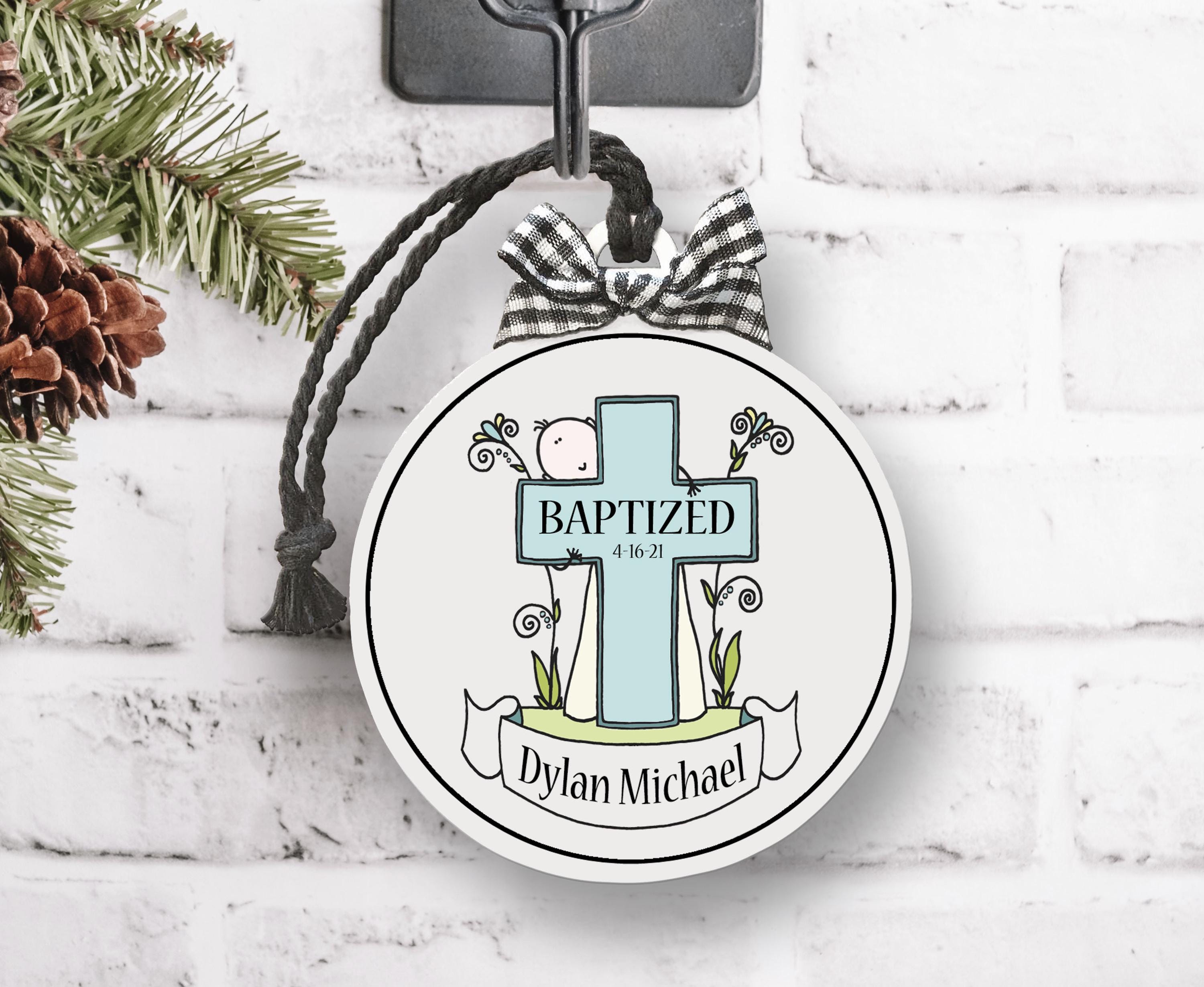 PERSONALIZED BAPTISM ORNAMENT that turns your baby’s baptism day into a keepsake you’ll reach for every year. Picture it on the tree, tied with a sweet gingham bow, a tiny BABY BAPTIZED figure holding a CROSS, and your child’s name and date centered beneath “Baptized.” Each ornament is a simple, RELIGIOUS reminder of prayers spoken and promises made, made personal just for your family. Perfect keepsake gift for Grandson, Son, Godson, Nephew.
