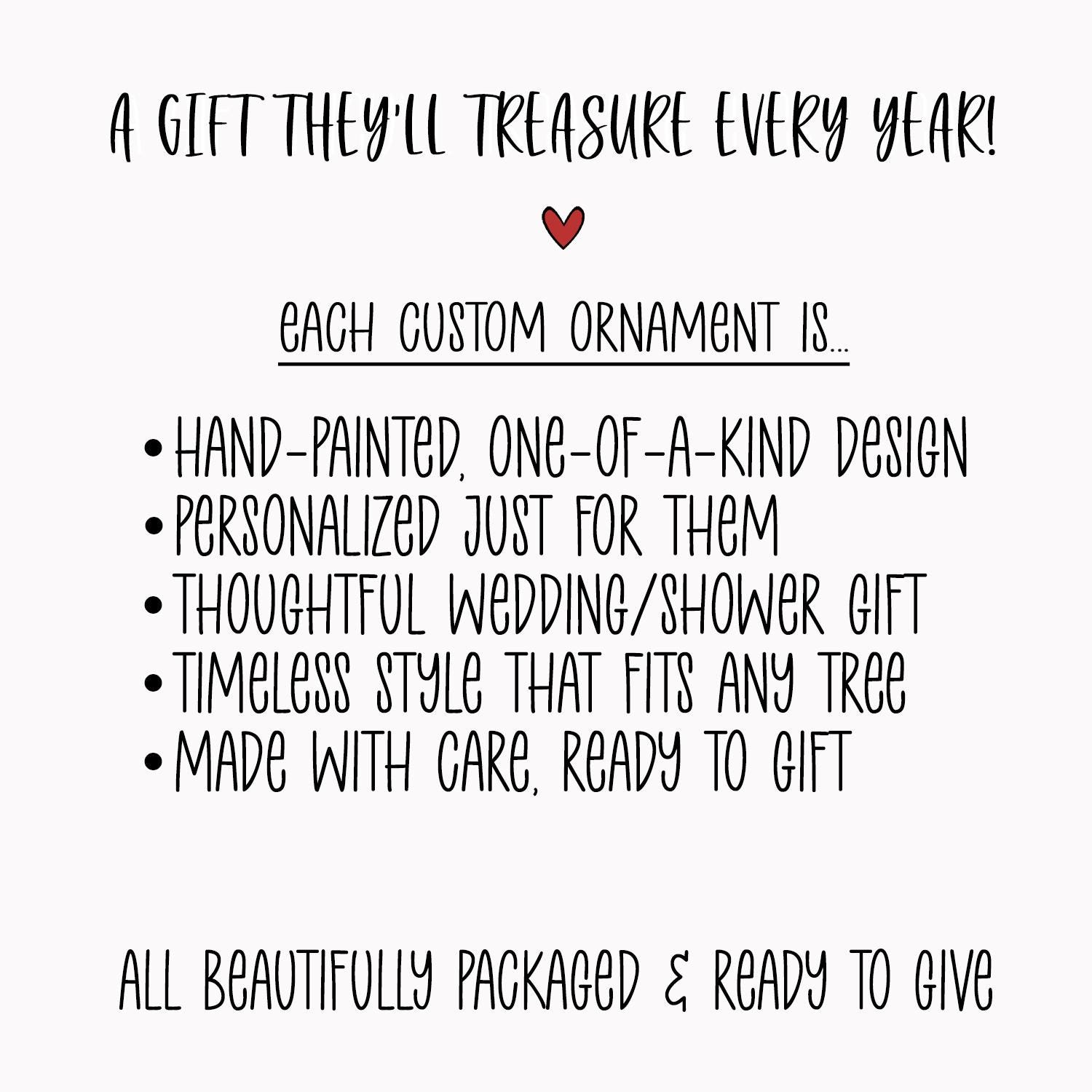 Celebrate the journey from “engaged” to “married” with a personalized wedding gift that captures every special moment. This handpainted ornament set featuring custom names and date creates a meaningful keepsake perfect for weddings, engagements, and newlywed celebrations.