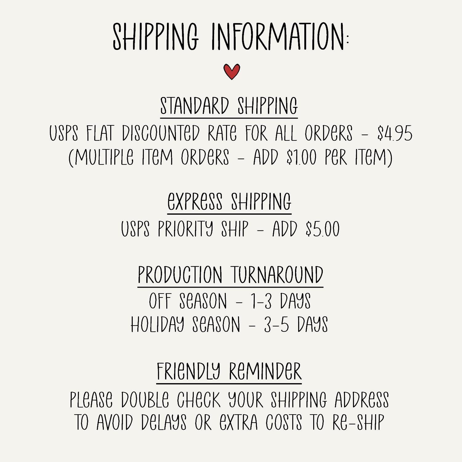 Typical turnaround: 2-3 days / Holiday Season: 3-5 days / Ships via USPS Ground Advantage