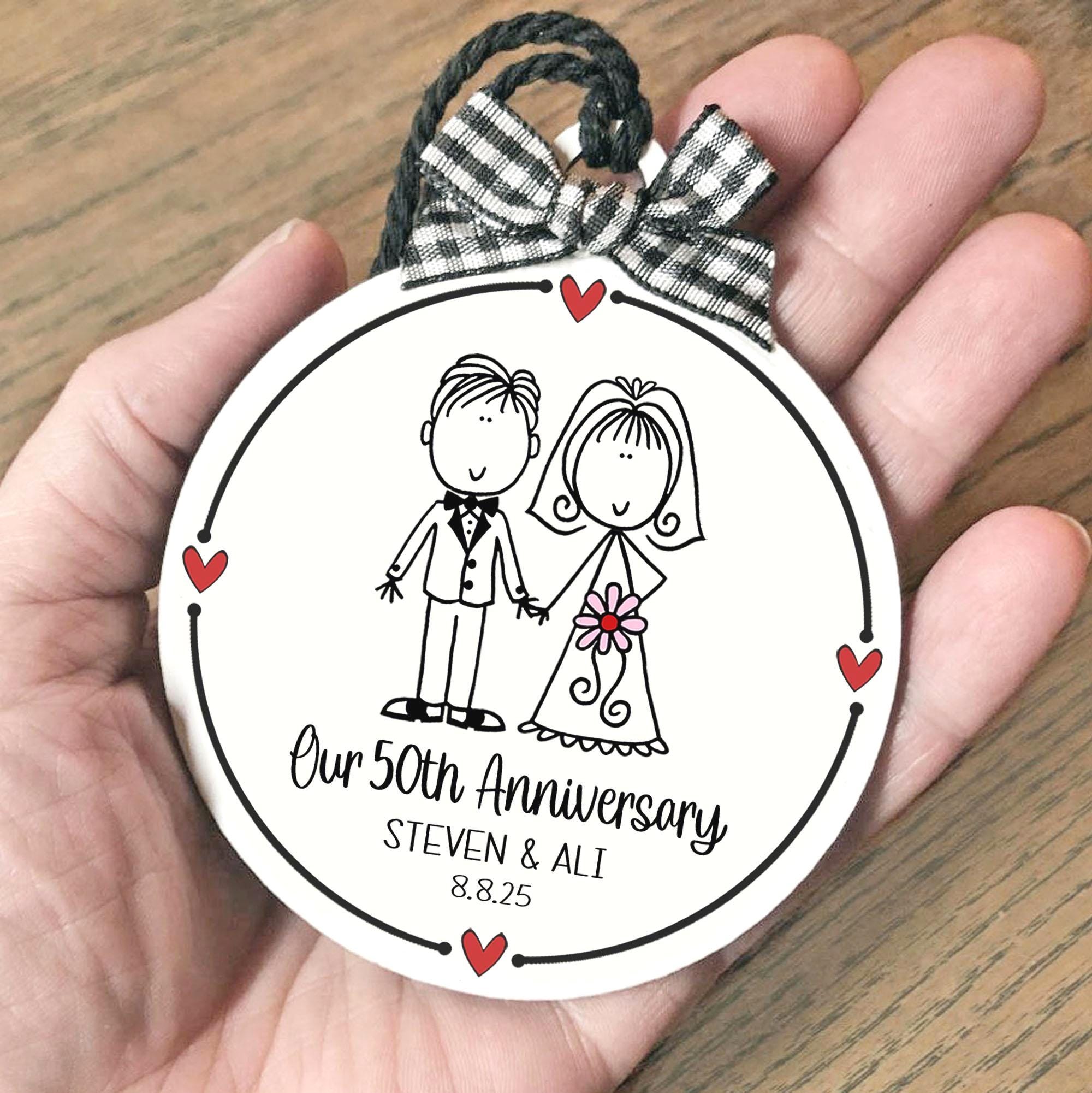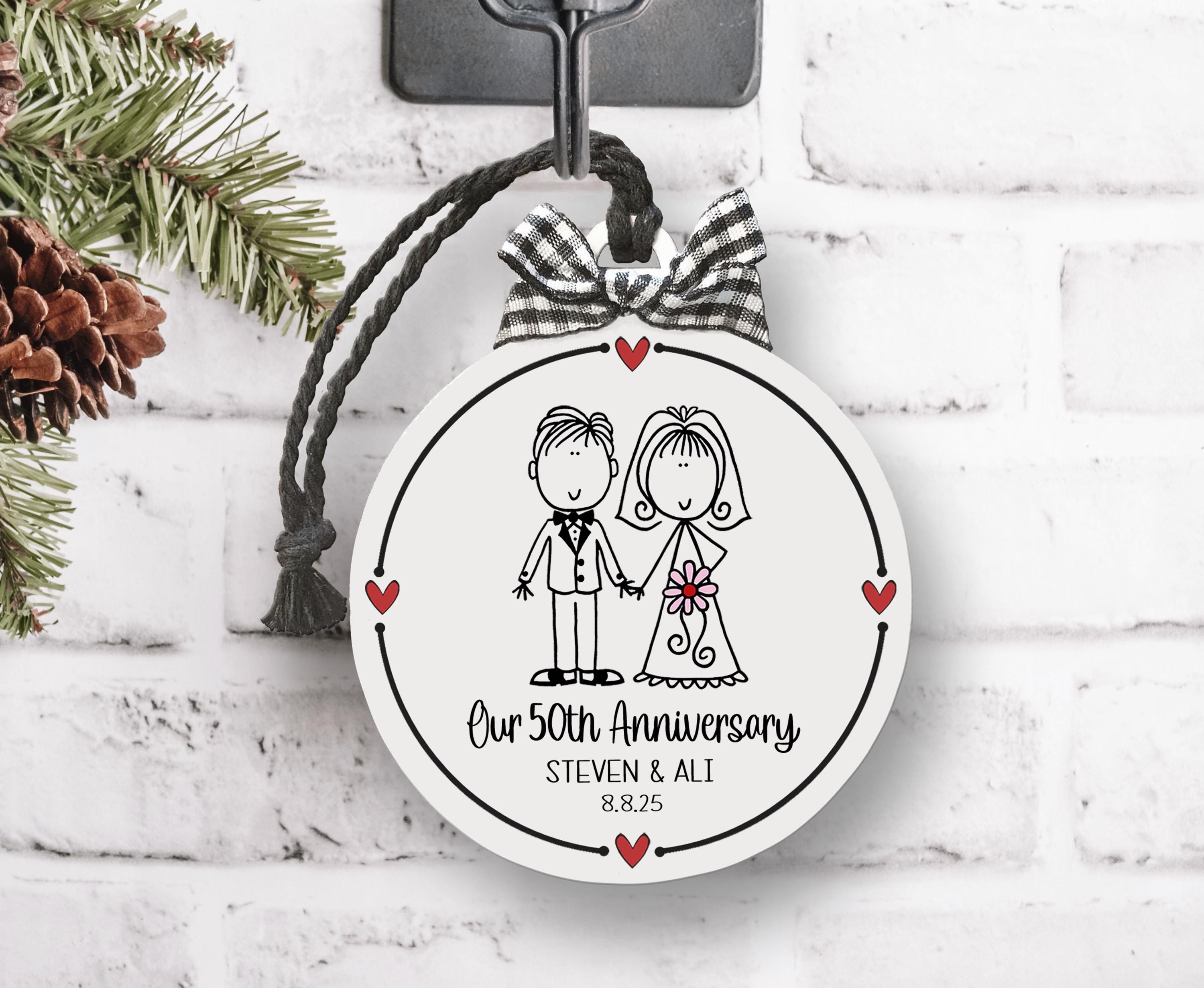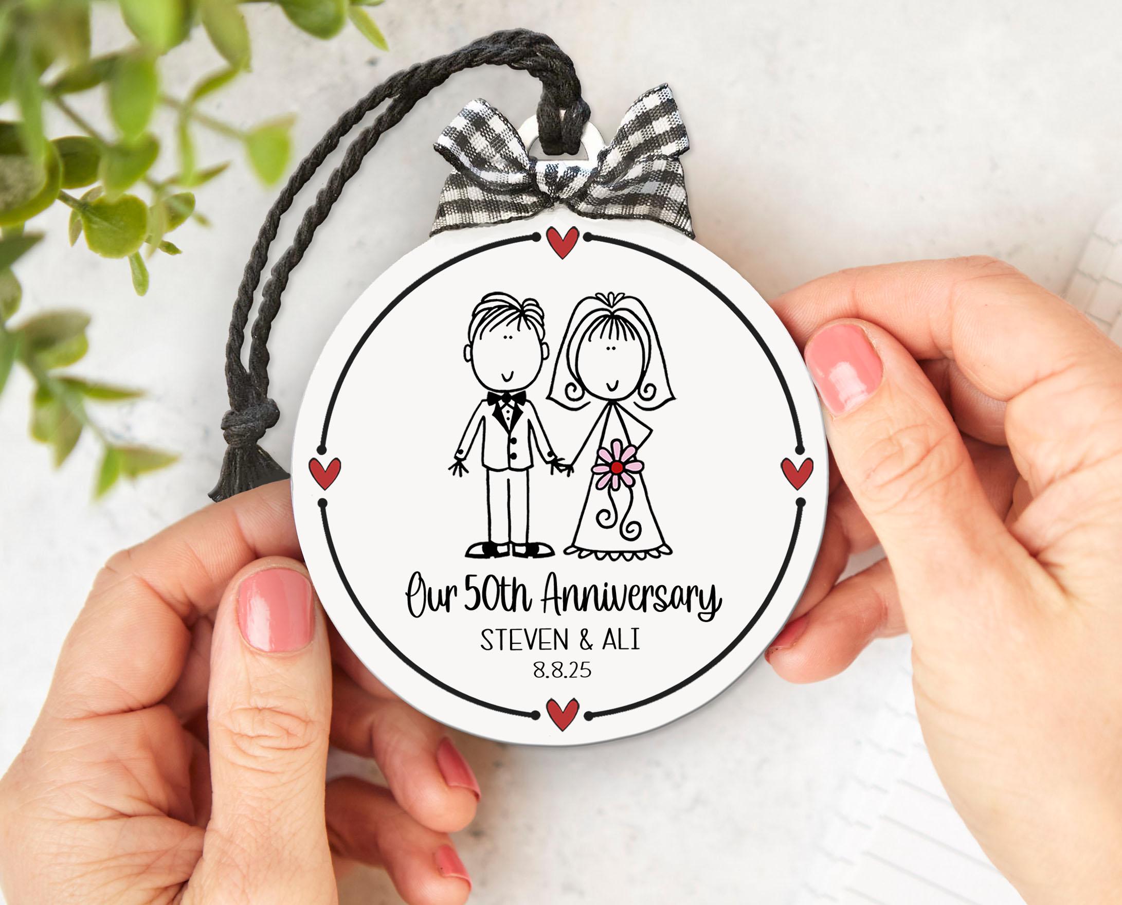 Looking for a meaningful and unique 50th Anniversary keepsake gift to celebrate their life together? These delightful personalized anniversary ornaments are the stand-out gift you're searching for! Individually handmade, each 3" round, flat keepsake ornament is customized with names and dates, and makes a delightfully unique and heart felt gift for those you love!
