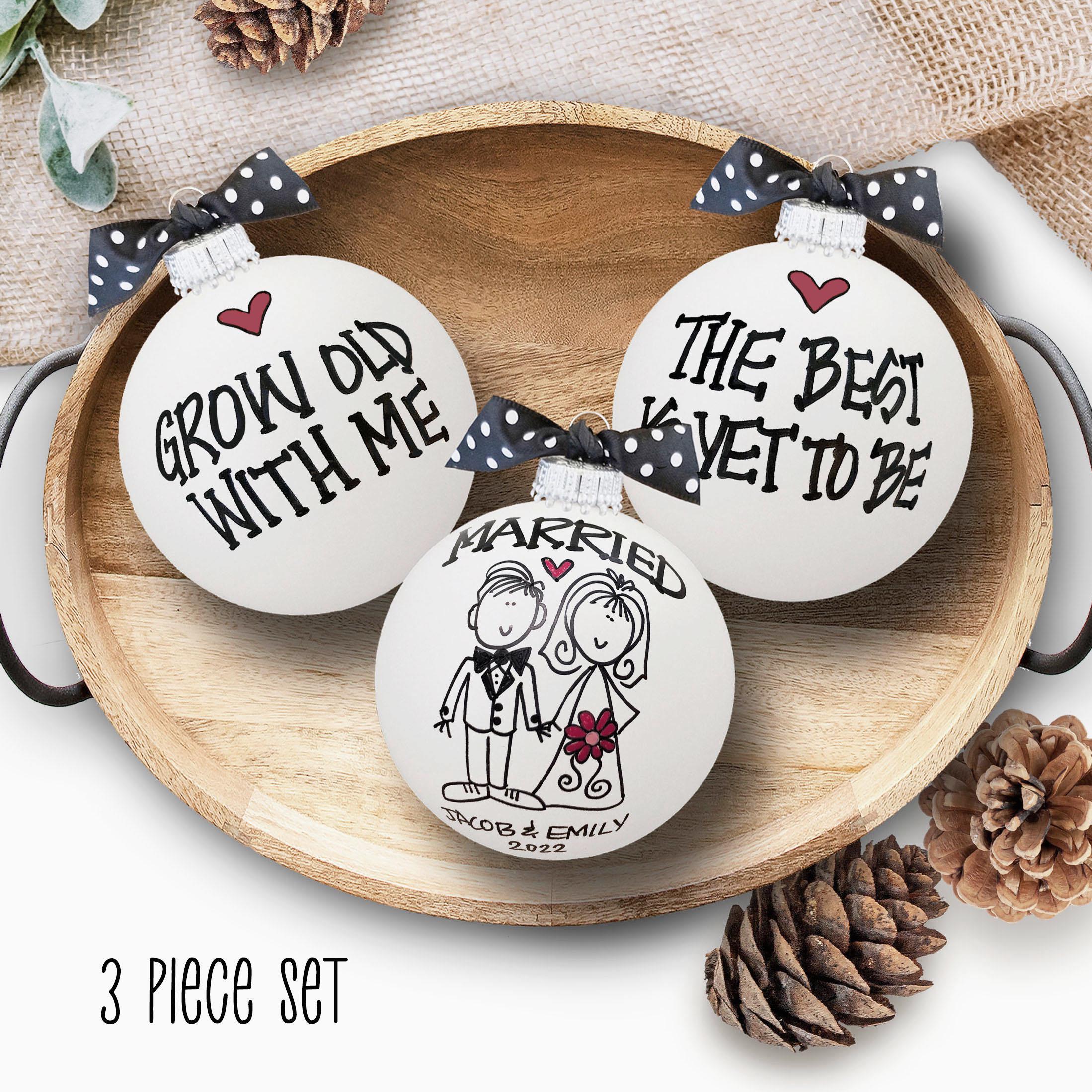Commemorate the happy couple's special day with this personalized Mr. & Mrs. Wedding Ornament Gift Set, custom-made to order. A perfect wedding, engagement or bridal shower gift, these beautifully crafted ornaments add a meaningful touch to their first Christmas as newlyweds and will be cherished for years to come. Thoughtfully designed with personalization options, this keepsake set includes 3 hand-drawn/painted glass Christmas bulbs and is guaranteed to be a stand-out gift for weddings, bridal showers, engagements or anniversaries!