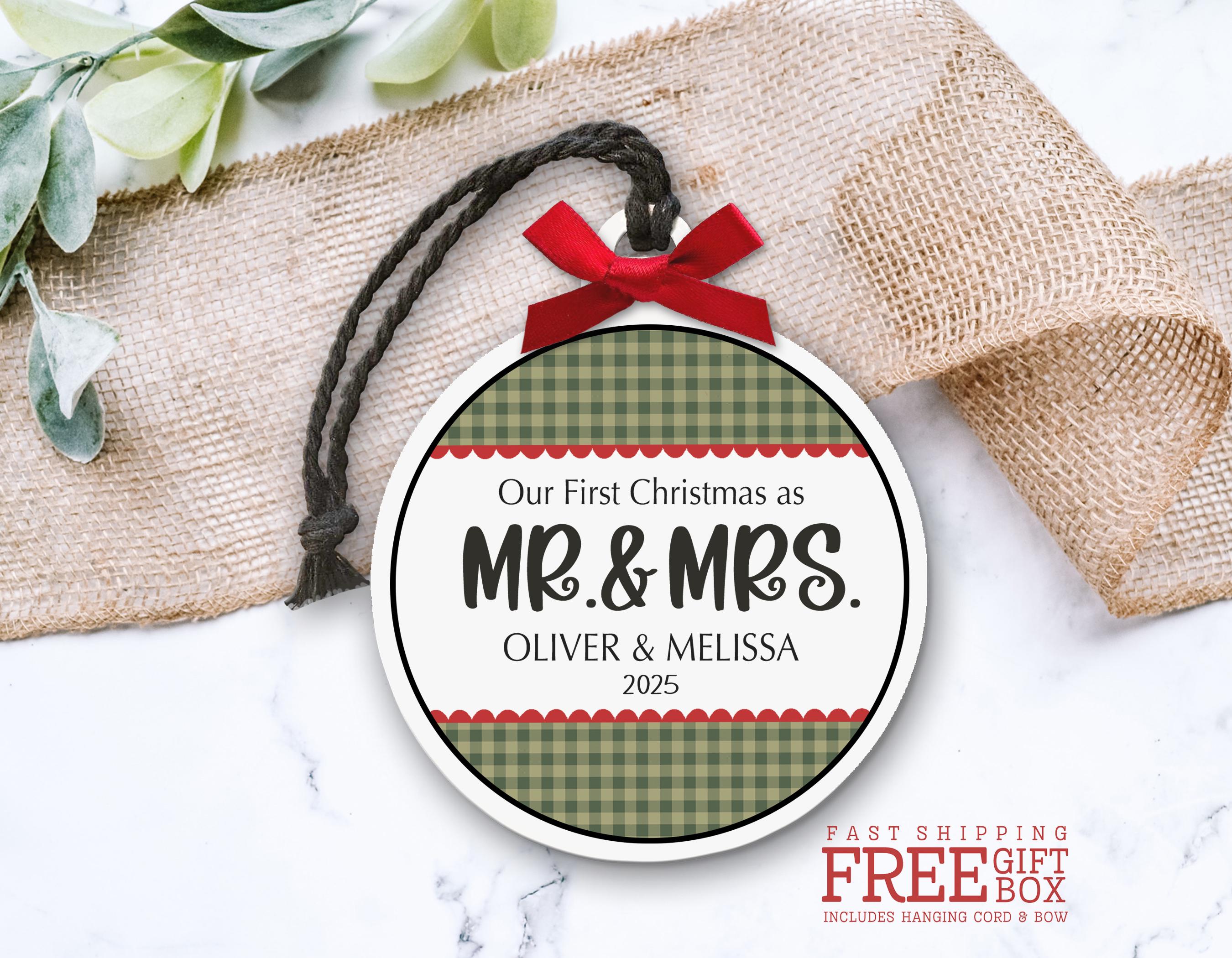 First Christmas Together Keepsake Ornament Personalized: Celebrate your first holiday season as Mr. & Mrs. with this custom Christmas ornament made just for you! Whether you're newly married, recently engaged, or shopping for the perfect bridal shower gift, this keepsake is a charming way to commemorate your love story.