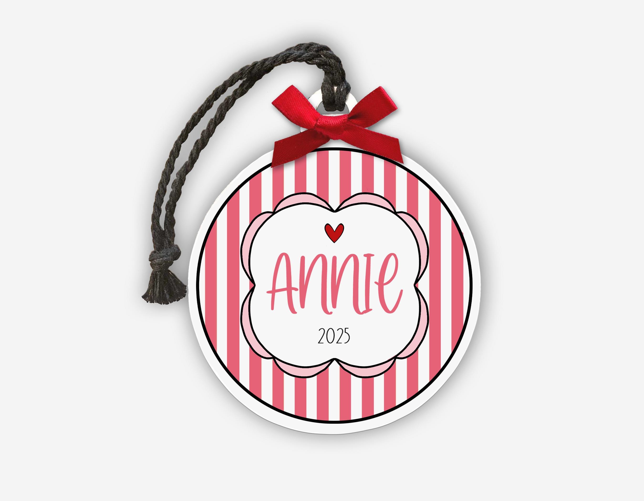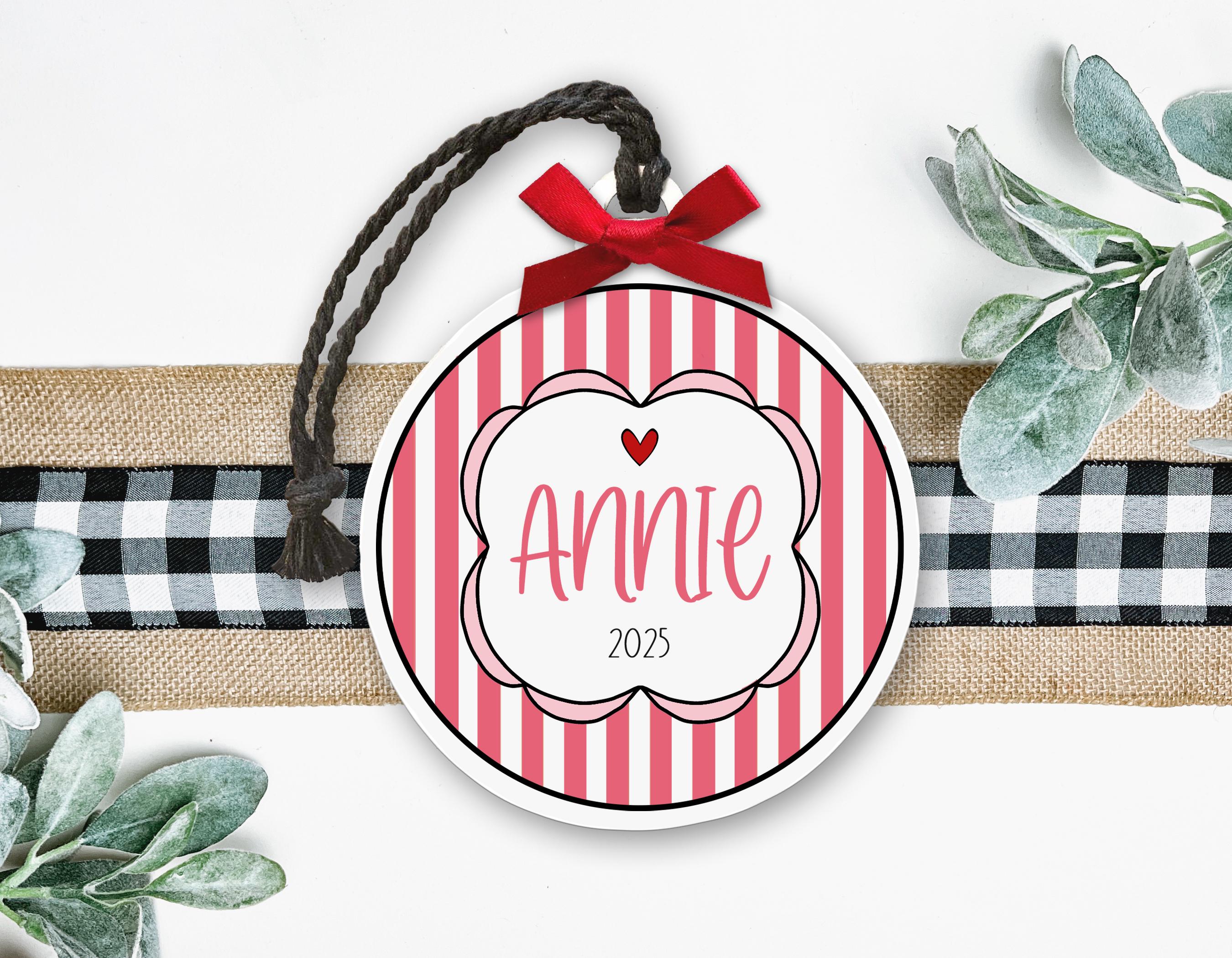 Add a pop of personality to the tree with this sweet, striped Christmas ornament featuring personalized name and the year. Perfect for kids, teens, or anyone who loves a festive, custom touch. A soft and sentimental keepsake to be treasured forever.