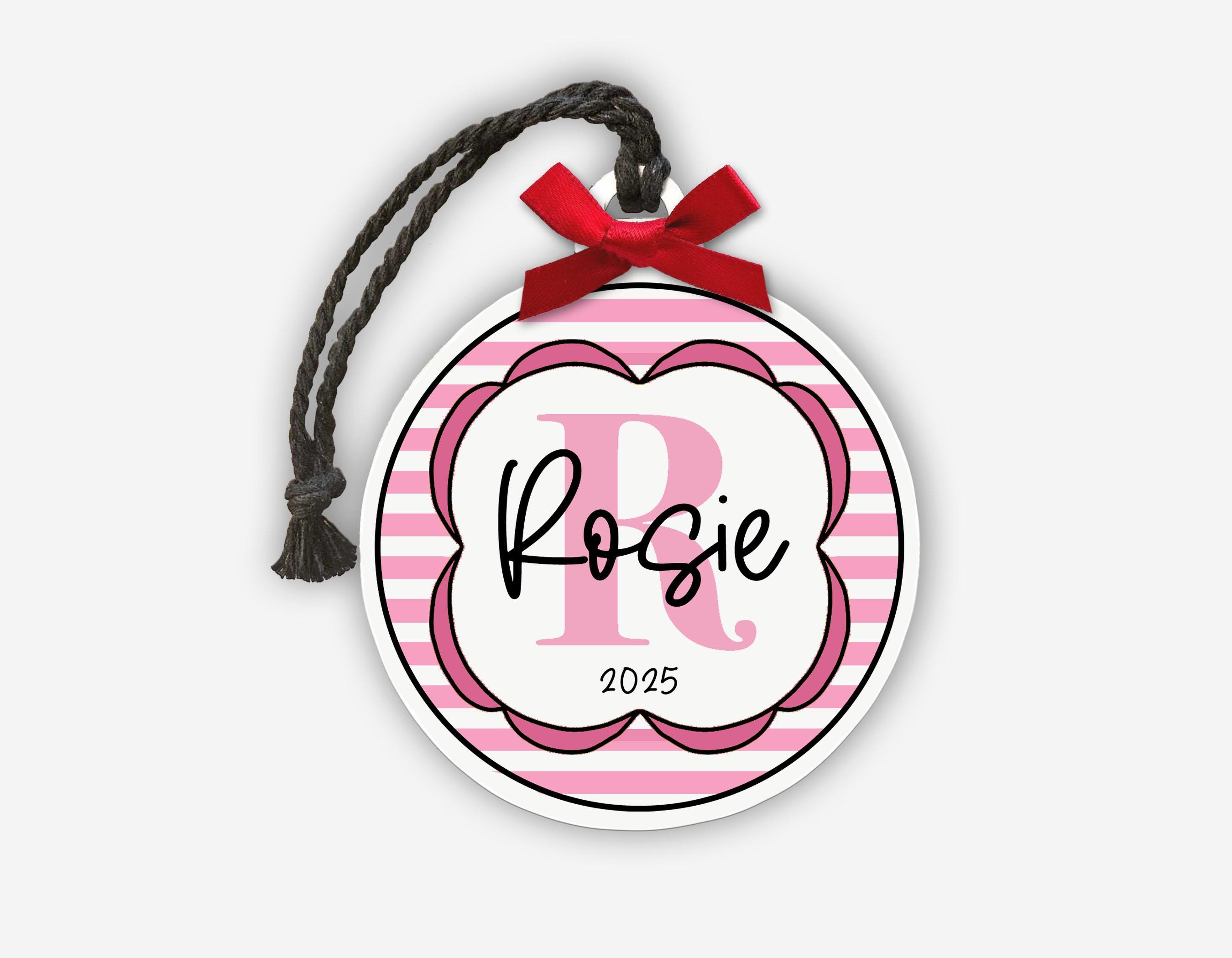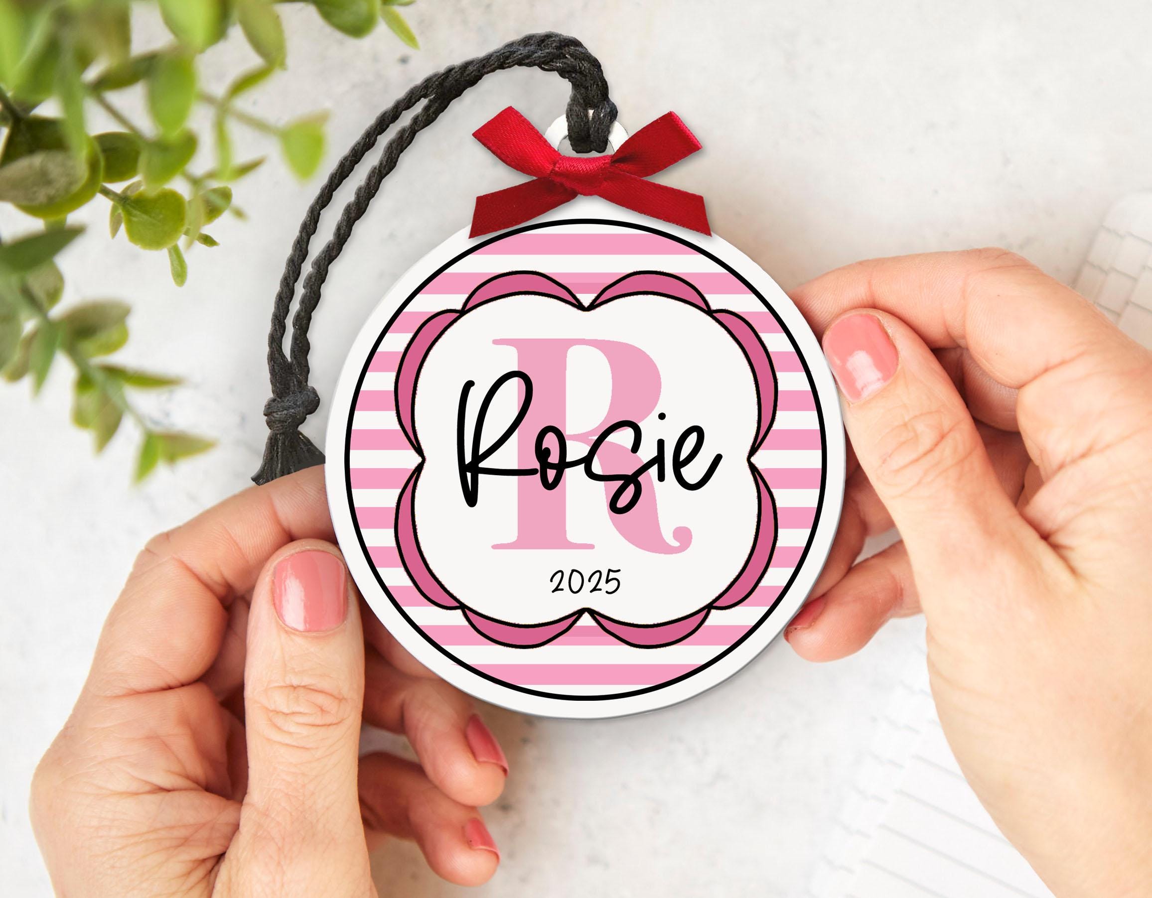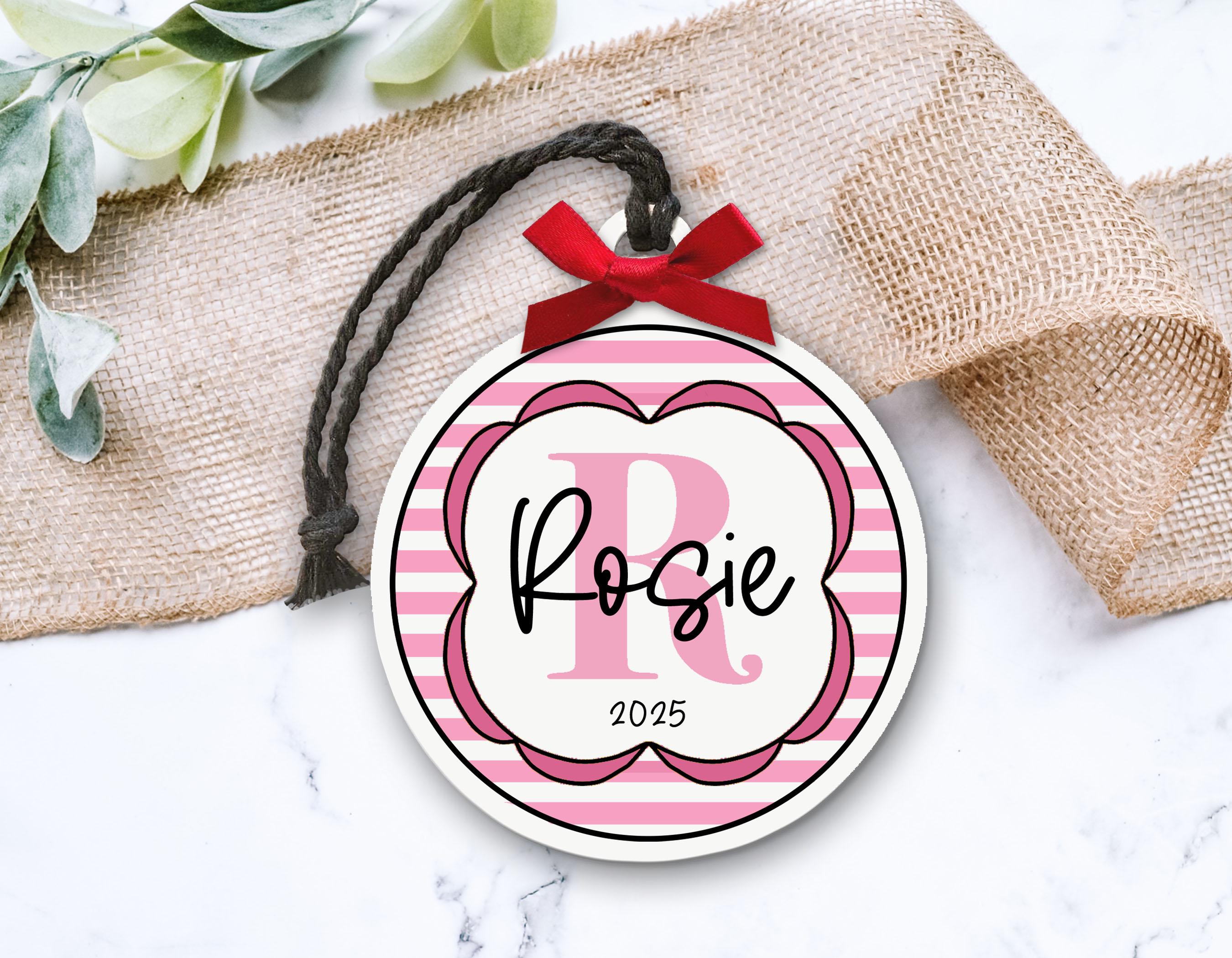 Personalized Name Christmas Ornament - 2025 First Name Keepsake Ornament: This adorable pink-striped ornament features a bold first initial and script name, making it the perfect keepsake for kids, teens, or anyone who loves sweet and simple personalization. A festive and feminine addition to any holiday tree.