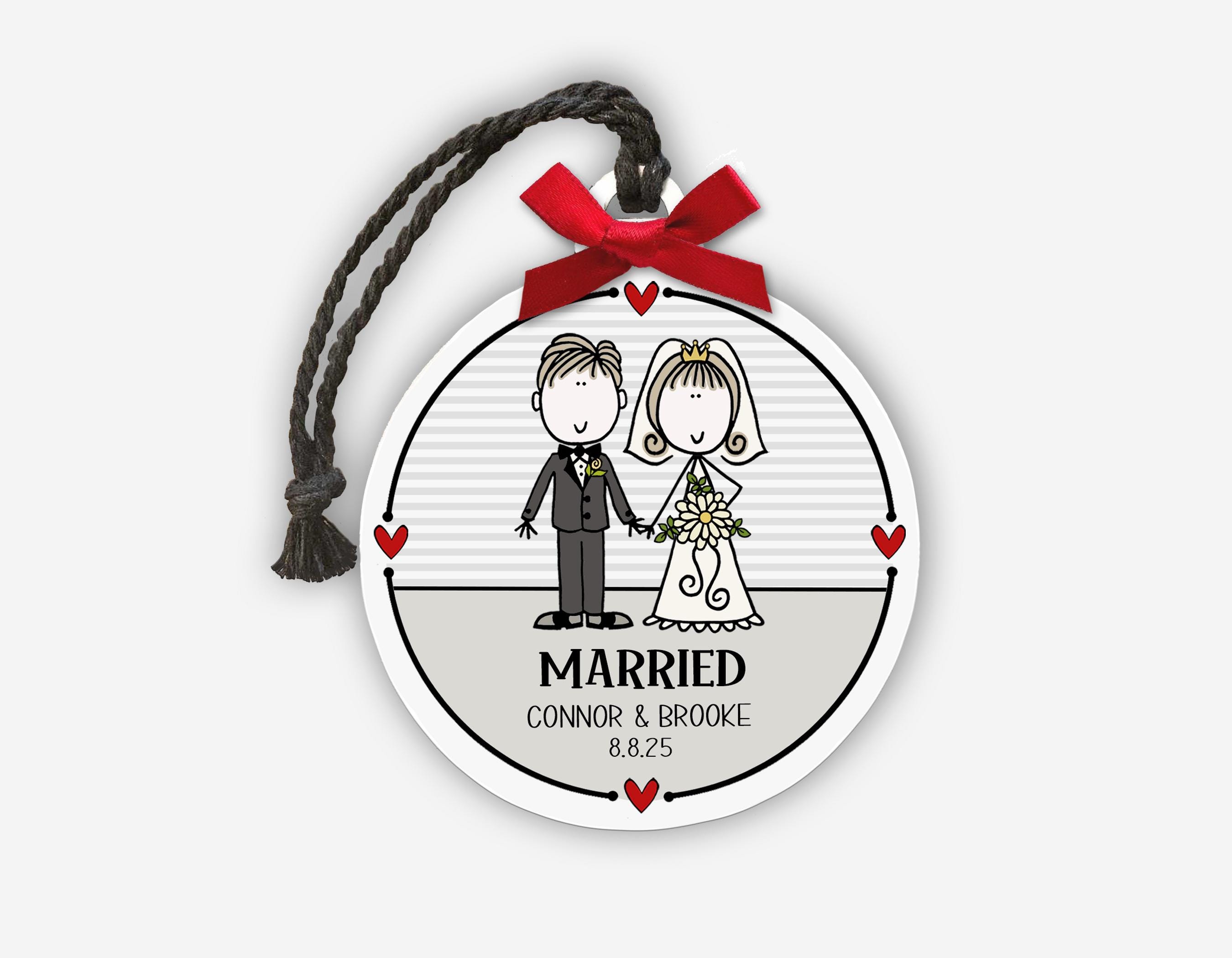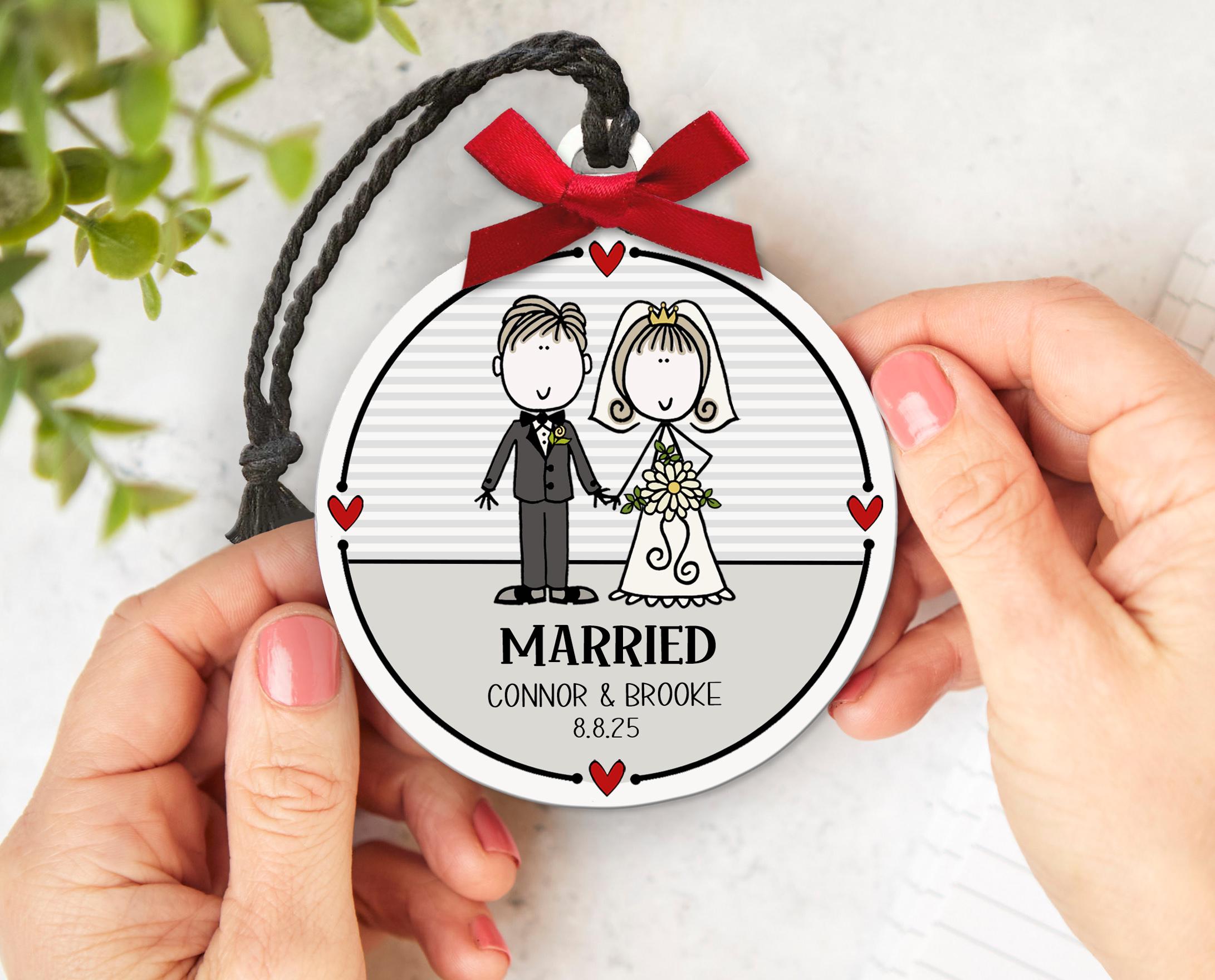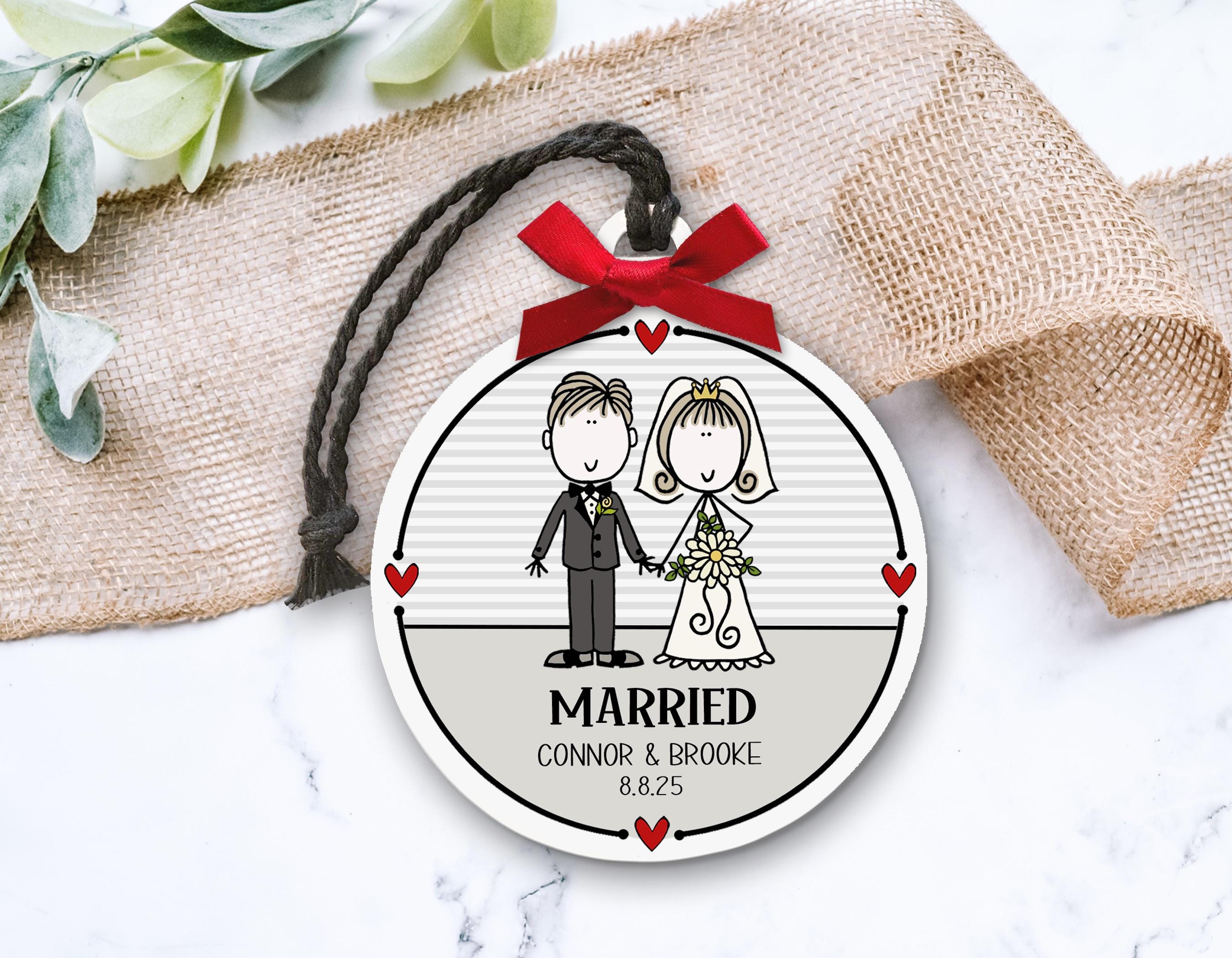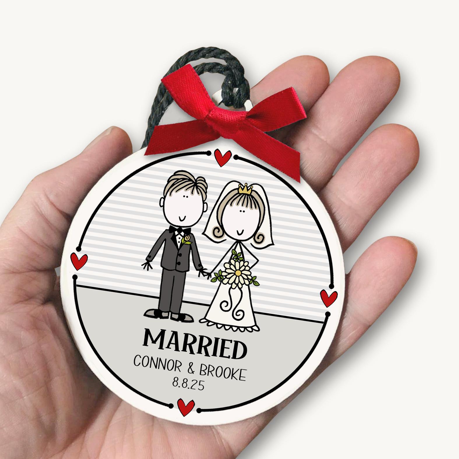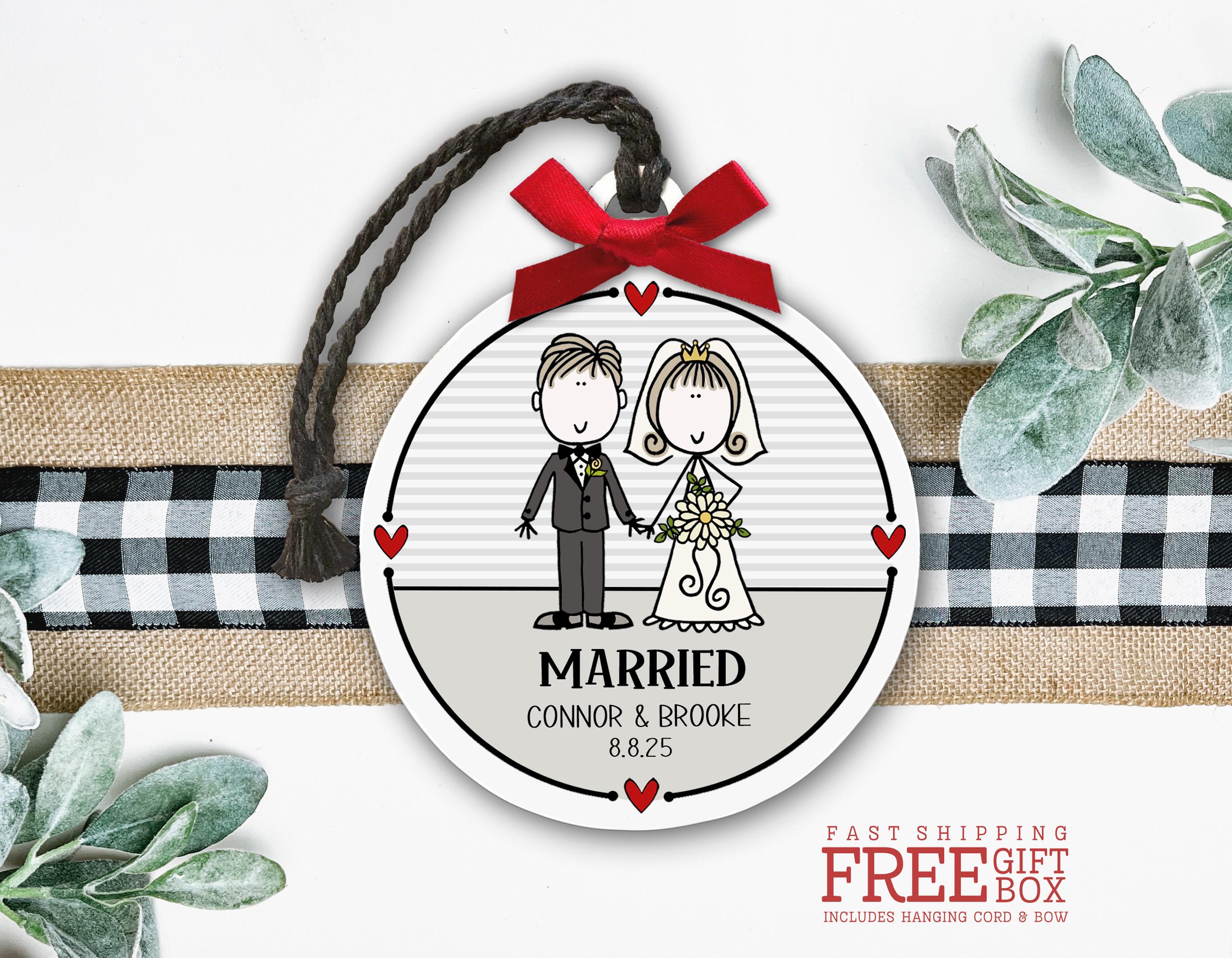 MARRIED Bride & Groom Ornament: Cheerful, thoughtful gift for Weddings, Bridal Showers, Newlywed's 1st Christmas together ... Celebrate their big day with a keepsake that’s as sweet and timeless as their love story! This personalized “Married” ornament features a happy stick-figure bride and groom holding hands, with their names and wedding date printed beneath. A lovely gift for newlyweds or a couple celebrating their first holiday season together.
