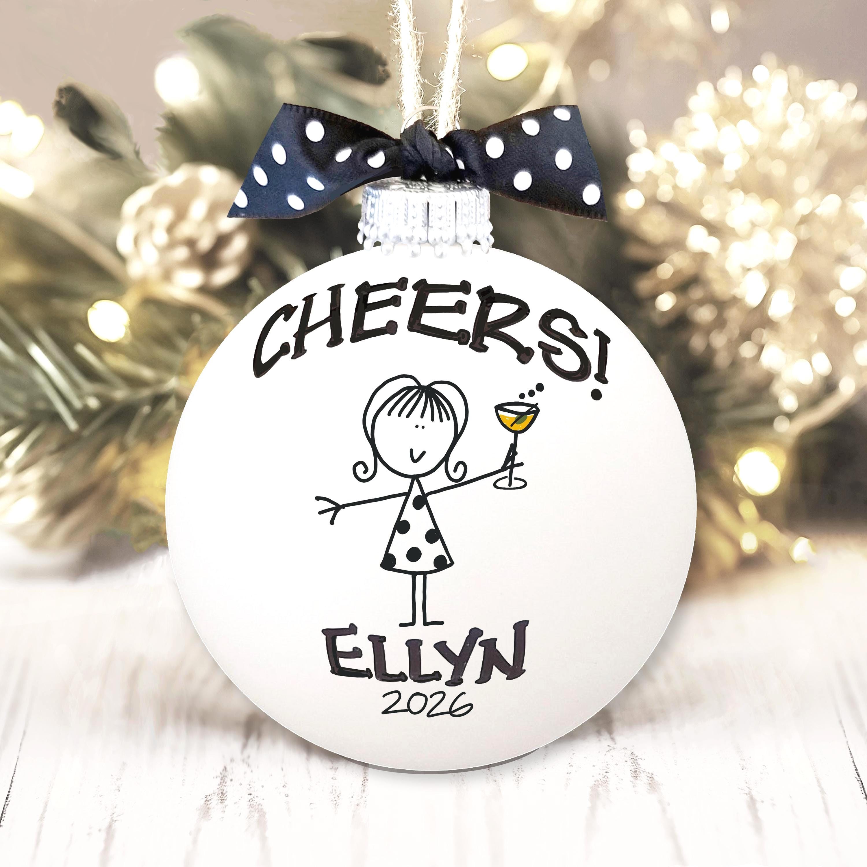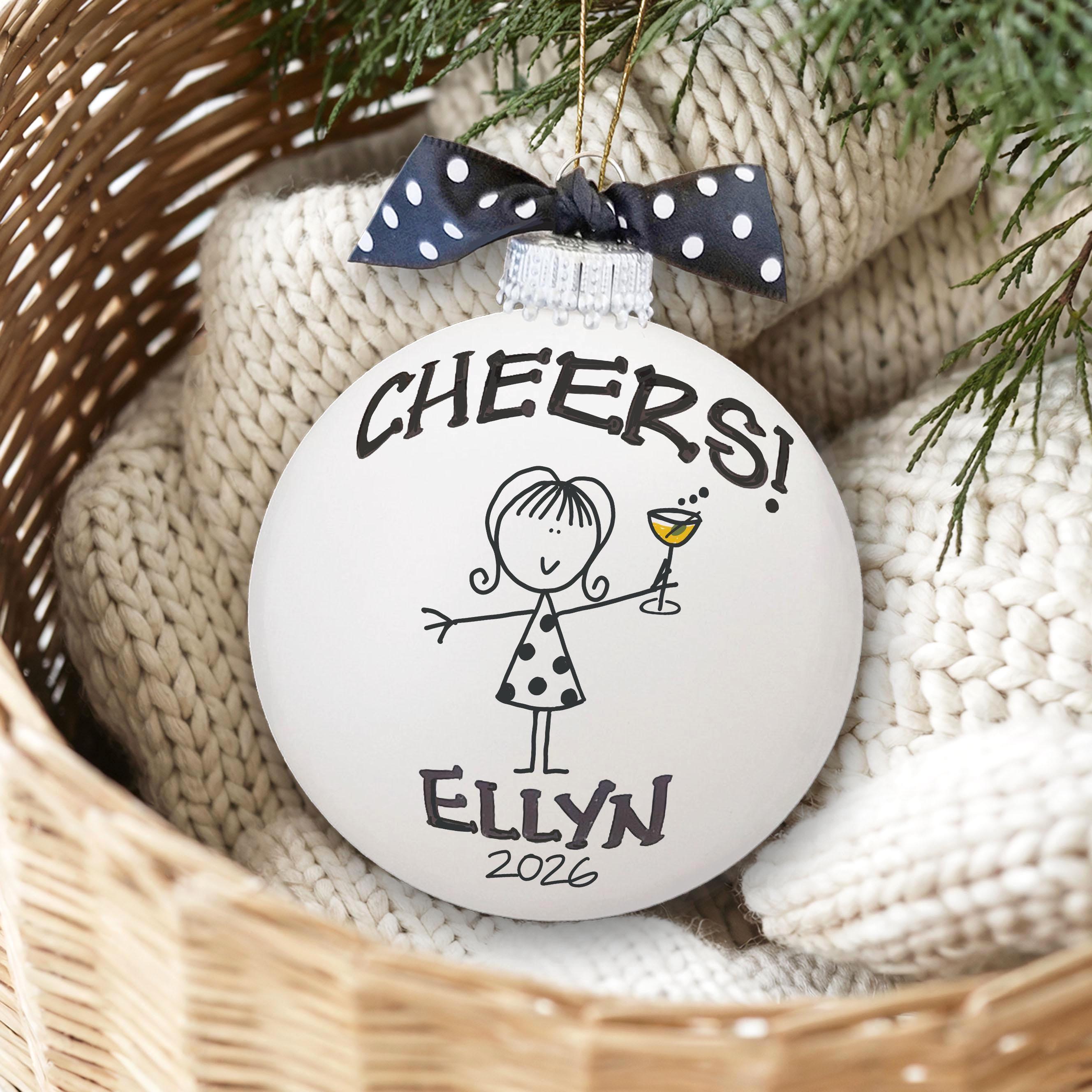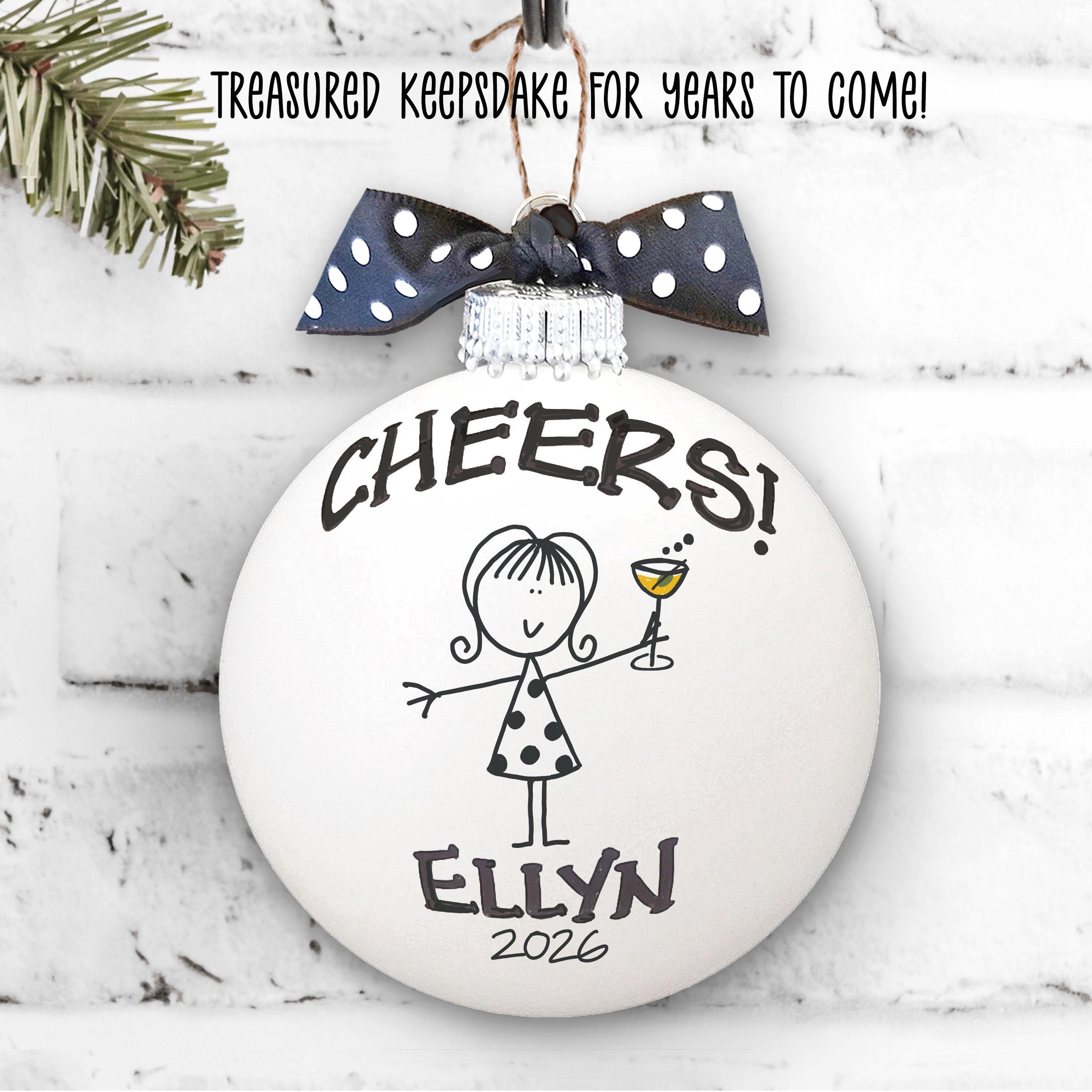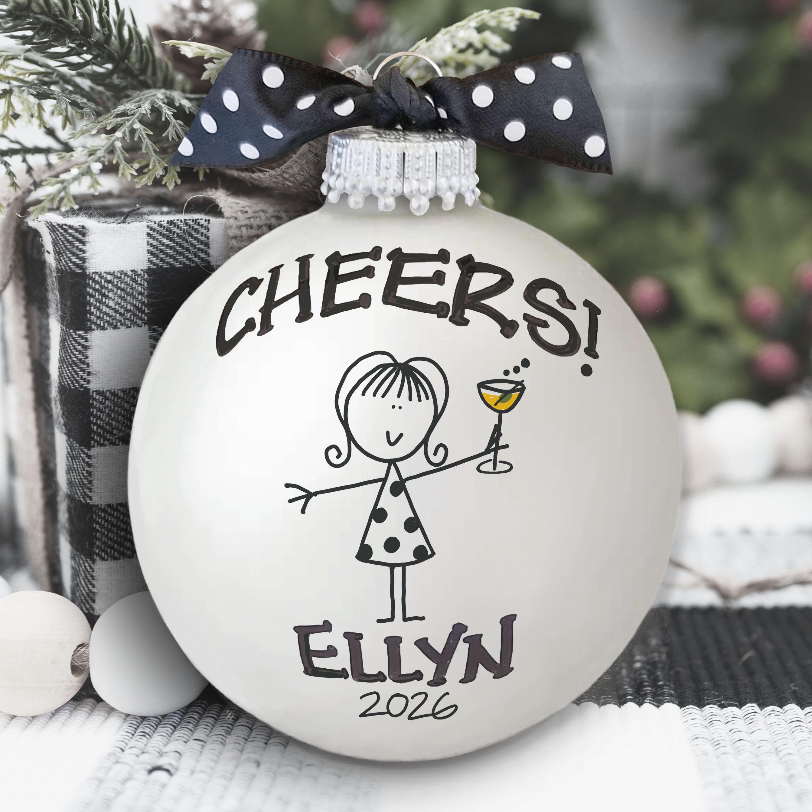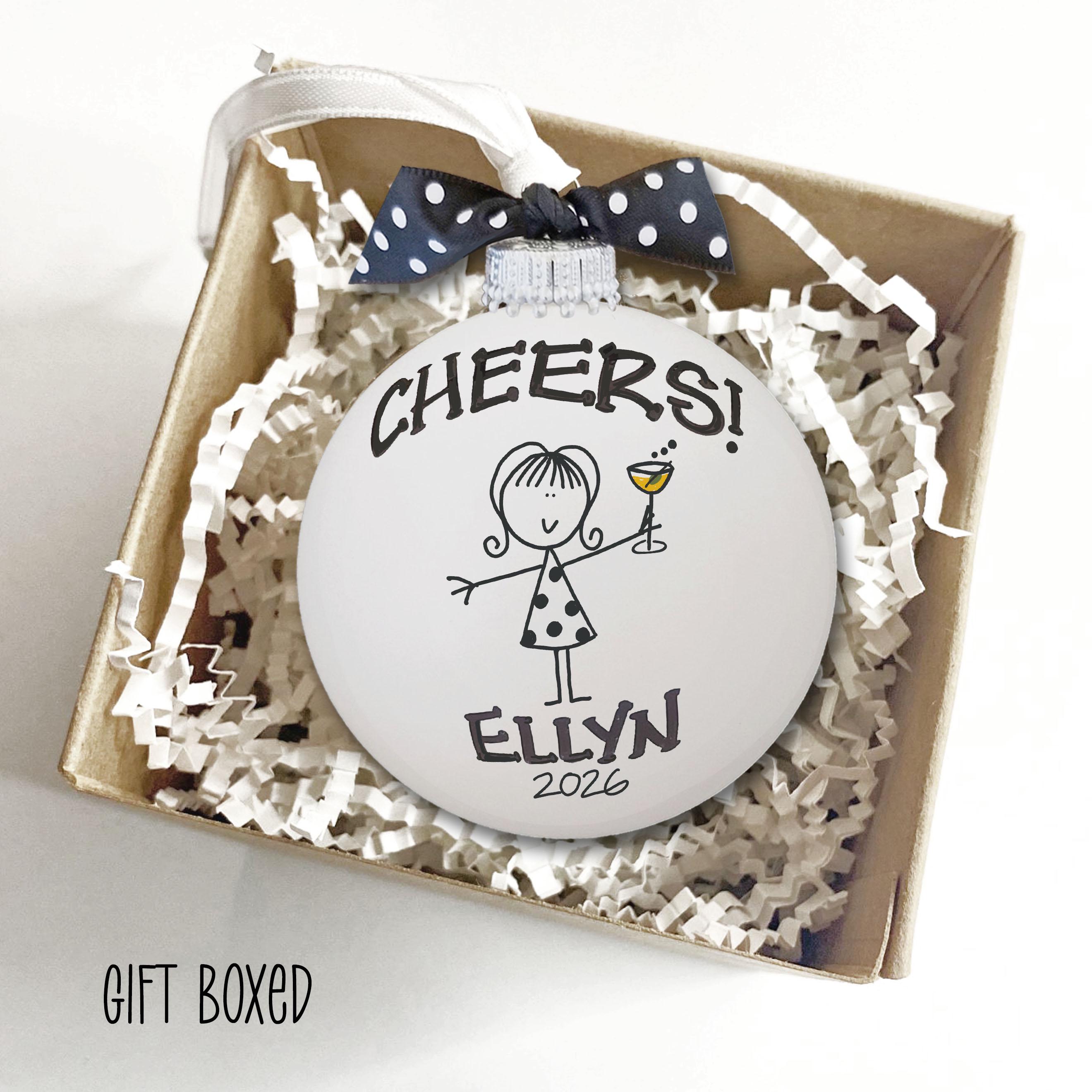 Personalized girlfriend, bachelorette, girls weekend ornament for the friend who turns every wine night into a little celebration, one clink at a time. Picture her on the tree, raising her tiny cocktail glass with a bold “cheers,” like your favorite toast captured forever. Add her name and year to make this best friend gift feel like an inside joke, a memory, and a promise to do it all again.