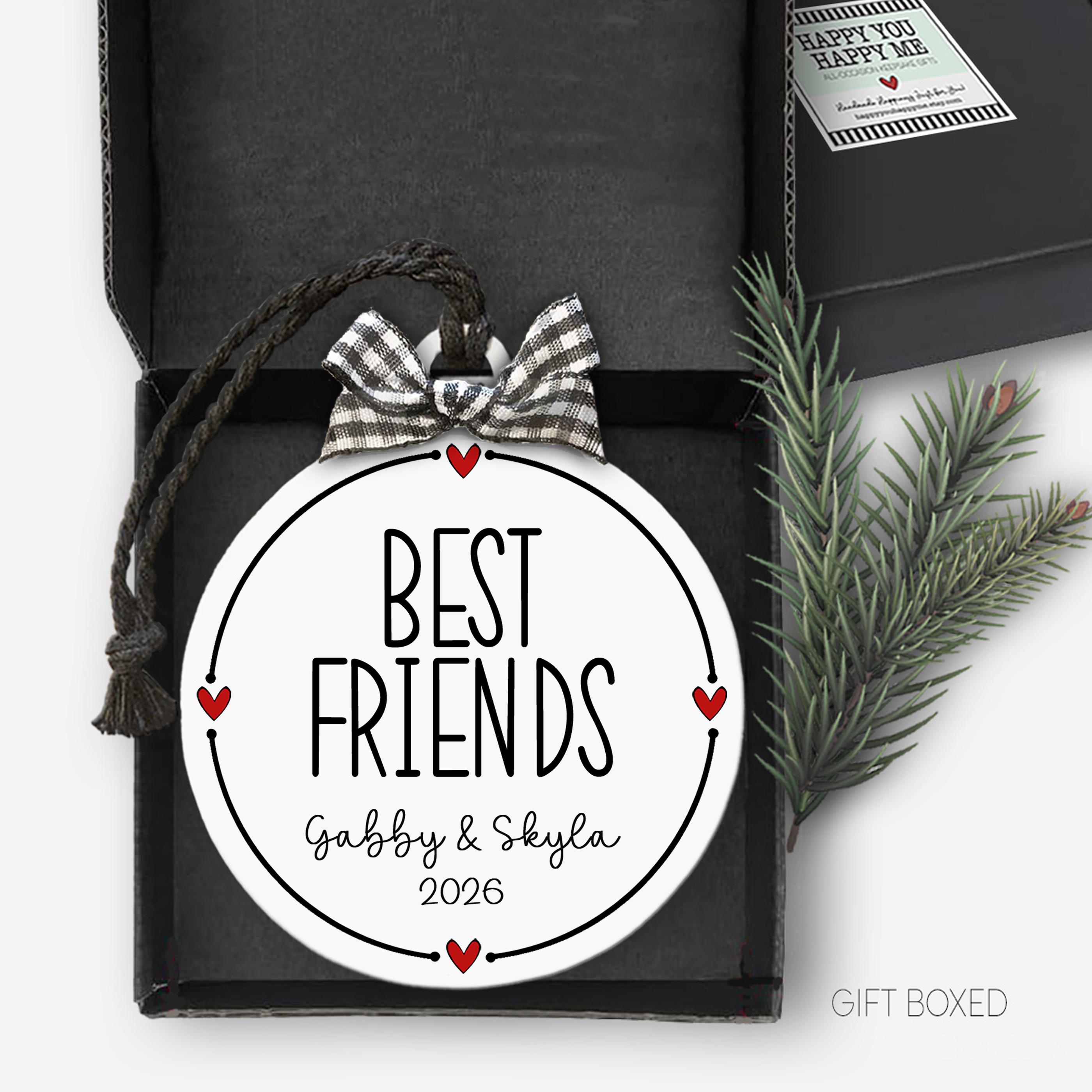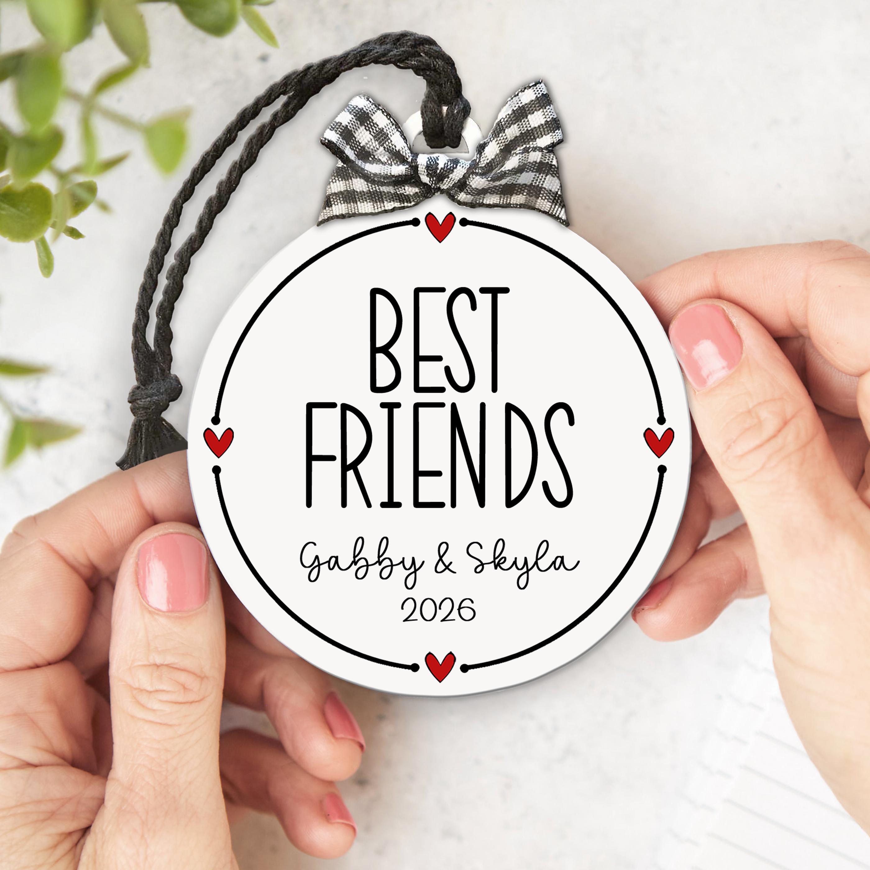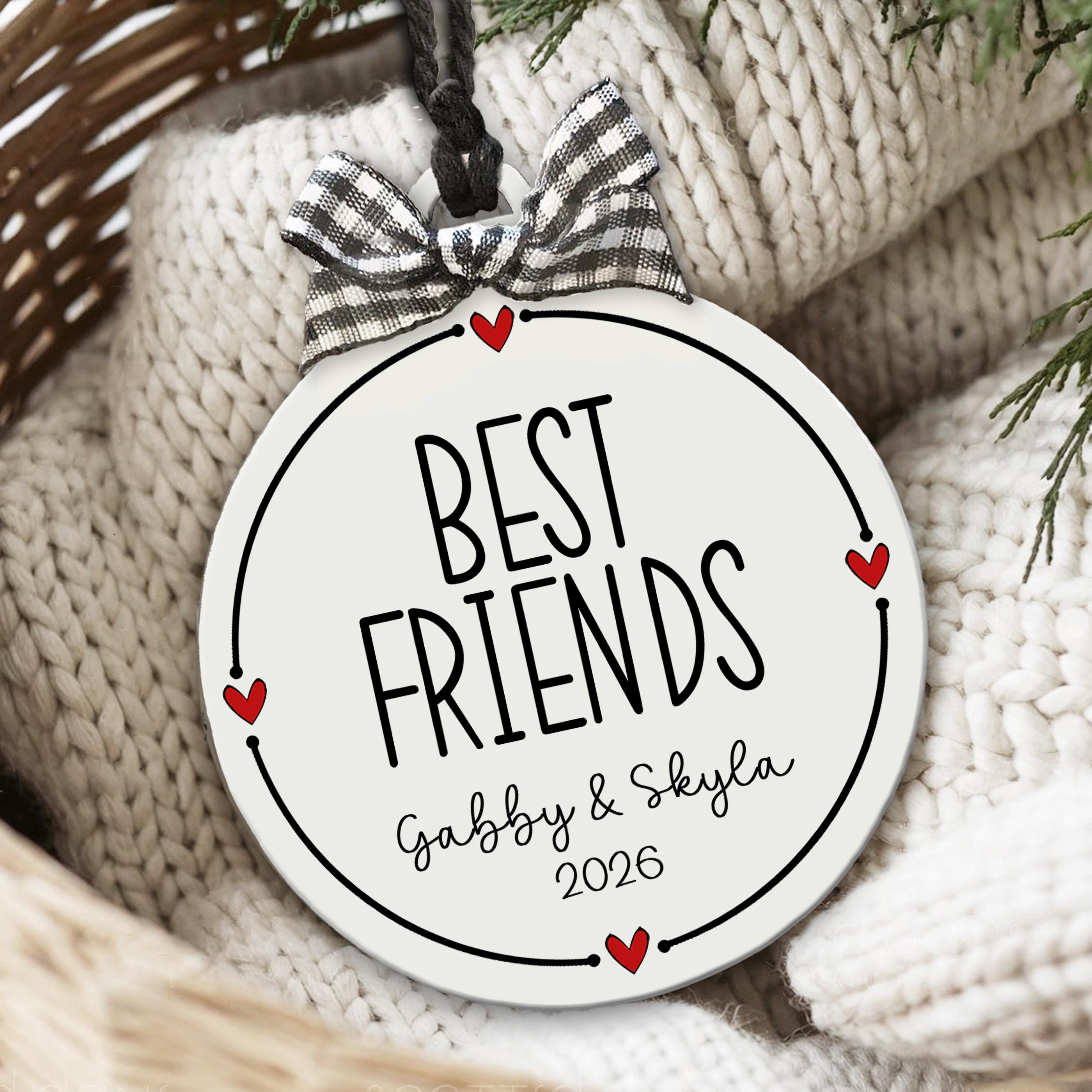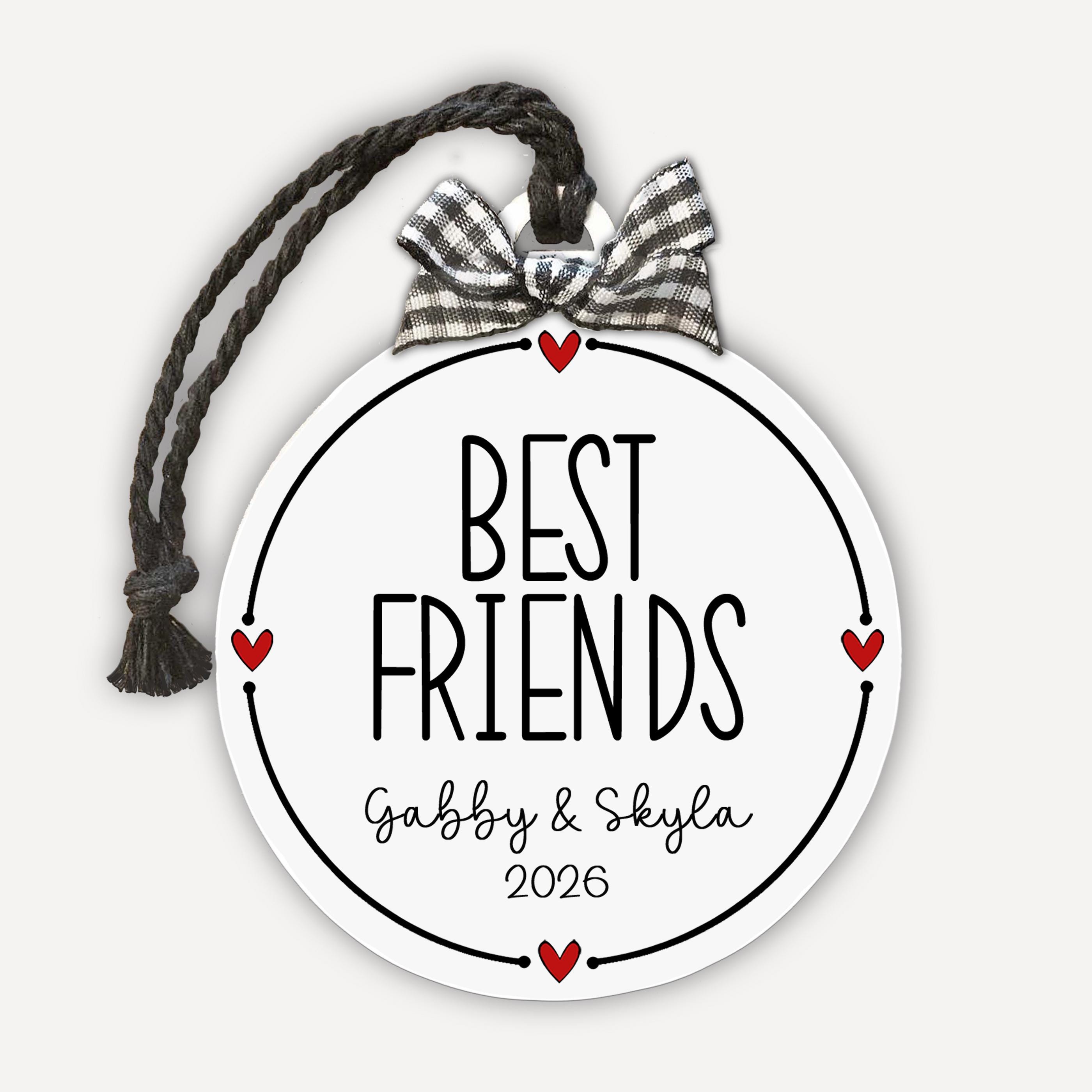 Personalized girlfriend ornament that turns your favorite friendship into a keepsake. Looking for a best friend gift that actually feels personal? Add your custom besties names year and this sweet black-and-white design with tiny red hearts and a cute gingham bow is ready to hang and make you both smile every holiday!